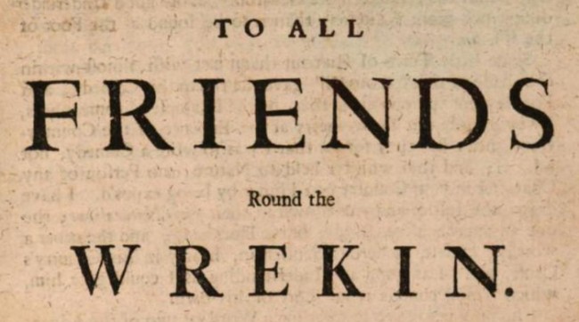 The oldest appearance I have found in print of “all friends round the Wrekin” dates back to around 1706, when playwright George Farquhar used it to open the published version of his Shropshire-based comedy The Recruiting Officer (the image above is from Google’s electronic version of this long out of copyright work). Clearly it was well-established even then. I have found many later references to this toast in Shropshire newspapers – it appears that the tradition was to make it the final toast after all the others had been offered and drunk to, by way of recognising the special bond between those connected by their county’s most revered landmark. Although I have not yet found any specific references to its use in Waters Upton, I have no doubt that it was spoken there, often, and with feeling.