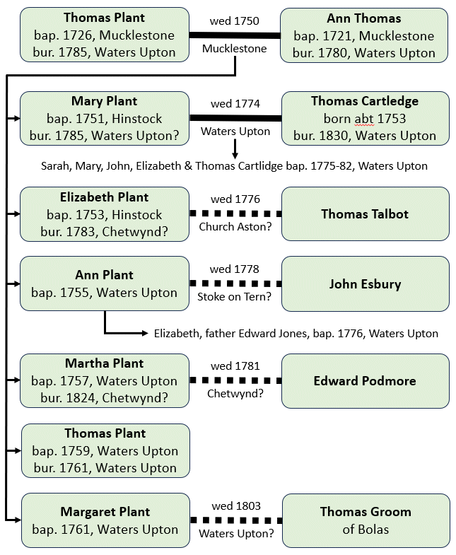 It appears that Thomas Plant of Waters Upton originated from Mucklestone, a parish which back then included parts of both Shropshire and Staffordshire. The baptism of “Tho: Plant Son of John Plant & Eliz: his wife” took place on 18 September 1726 🡕 (making Thomas just under 50 rather than “upwards of” that age at the beginning of 1776). Then, on 4 September 1750 🡕 and also in Mucklestone, the wedding of “Thomas Plant & Ann Thomas both of this Parish by Banns” took place.
