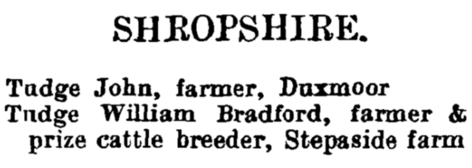 Stepaside Farm was still this family’s home in 1913, when William Bradford Tudge, “farmer & prize cattle breeder,” was listed in that year’s Kelly’s Directory of Shropshire 🡕 as part of the entry for Onibury (the snippet from the directory, on the University of Leicester website 🡕, is used under a Creative Commons licence 🡕). His details appeared just below those of his father John, who farmed at Duxmoor. These listings were repeated in the 1917 directory (viewed at Ancestry: Herefordshire and Shropshire Directories, 1917).