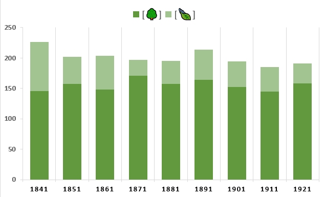 The “recent work on the ‘forest’” that I mentioned in my introduction to this article is an attempt to generate some meaningful data from the Big Tree markers. Using census Tree Tags that I had already created, I filtered the list of people in the OPS forest to view those enumerated at Waters Upton in each of the censuses from 1841 to 1921. Then I made sure all of those people had [🌳] or [🍃] markers. This has provided numbers, at fixed points in time over a period of 80 years, for Waters Upton residents who were (or were not) in the Big Tree.
