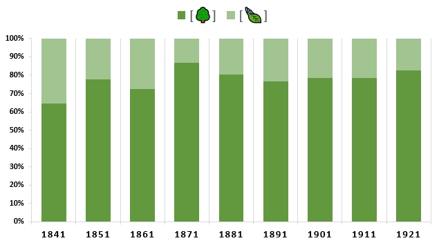 The “recent work on the ‘forest’” that I mentioned in my introduction to this article is an attempt to generate some meaningful data from the Big Tree markers. Using census Tree Tags that I had already created, I filtered the list of people in the OPS forest to view those enumerated at Waters Upton in each of the censuses from 1841 to 1921. Then I made sure all of those people had [🌳] or [🍃] markers. This has provided numbers, at fixed points in time over a period of 80 years, for Waters Upton residents who were (or were not) in the Big Tree.