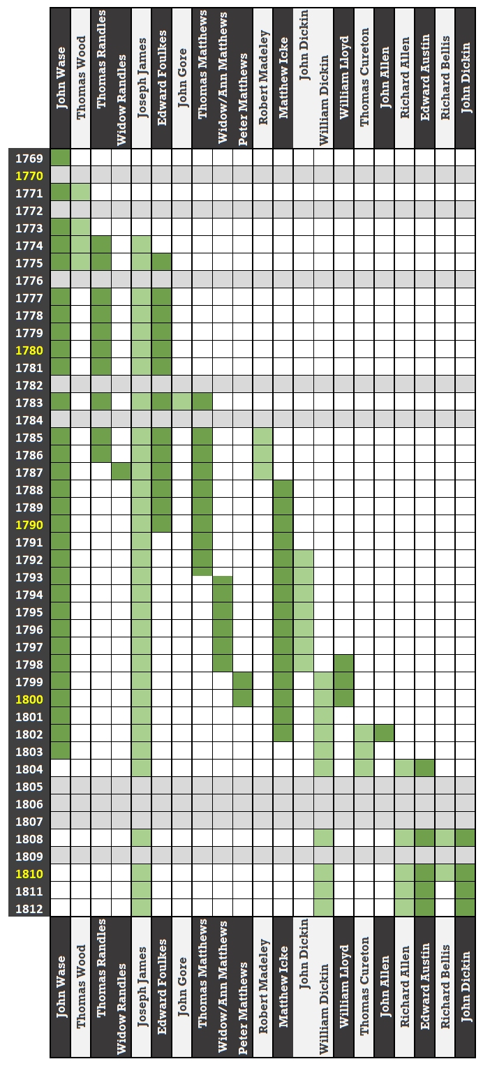 The grey lines across the chart indicate years – nine in all – for which I have found no published notices from the Cold Hatton Association in the period from 1769 to 1812. Three of those nine are, unfortunately, successive years: from 1805 to 1807. Otherwise, thankfully, there are one or more years on either side of the various gaps in the record, for which published notices are known. Bringing all of them together provides a useful resource for researching the area and its people, towards the end of a long period lacking the more detailed records created in later decades.
