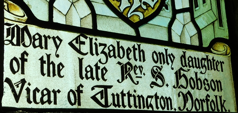 Middle window: Mary Elizabeth only daughter / of the late Rev. S. Hobson / Vicar of Tuttington, Norfolk.
