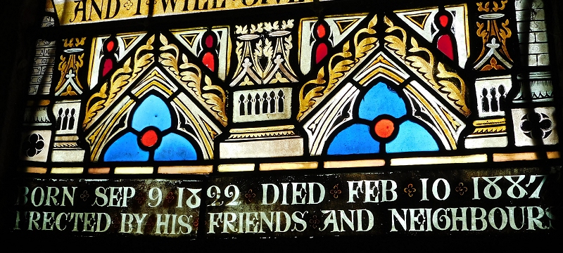 Right window: BORN SEP 9 1822 DIED FEB 10 1887 / ERECTED BY HIS FRIENDS AND NEIGHBOURS