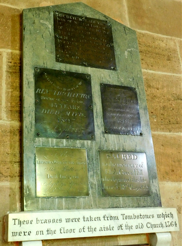 Inscribed on the foot of the tablet: These brasses were taken from Tombstones which were on the floor of the aisle of the old Church. 1864