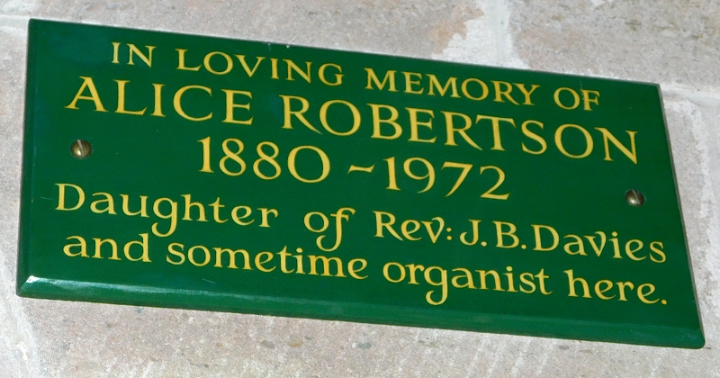 Small green plaque with yellow lettering, between door to vestry and the organ –