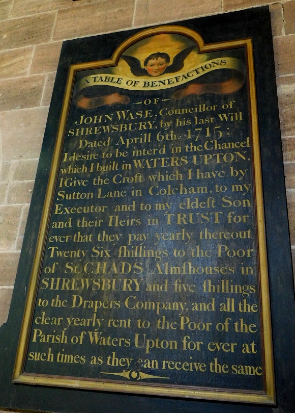 (Below the tablet hangs a framed list of the “Incumbents of Waters Upton,” which is surrounded by five framed illustrations of the church.)