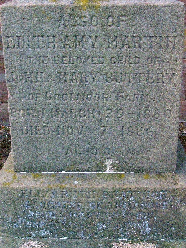 The 1881 census shows John Buttery and his wife Mary (daughter of John and Mary Ann Martin) living at Coolmoor, Stanton Upon Hine Heath, with their daughter Edith Amy Martin. Edith had been born in the parish of Ercall Magna in 1880, evidently before the marriage of her parents, which was registered in the September quarter of that year. See also Memorial Inscriptions: Martin.