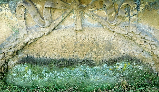 Lichen growth has rendered almost all of the inscription on this side of the tomb illegible, but “WILLIAM DICKIN” and “AGED 76 YEARS” can be made out. This was William Dickin, baptised 19 February 1754 at High Ercall, son of John (and Sarah, née Walmsley) Dickin of Roden in that parish. By the time he married, on 30 January 1796 at Wem, he was a farmer “of the Parish of Waters Upton”. He was buried in St Michael’s churchyard on 10 September 1830, his entry in the burial register recording his age at death as 76.