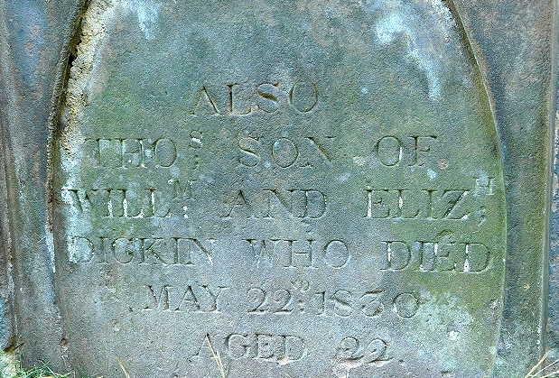 Possibly the William, son of William and Elizabeth Dickin (see below), who was baptised at Waters Upton on 12 Feb 1802. However the parish register shows the burial of “Willm son of Willm & Elizabeth Dickin” on 29 Oct 1805, which does not appear to relate to the November date inscribed on this stone – unless the wrong month was entered in the register.
