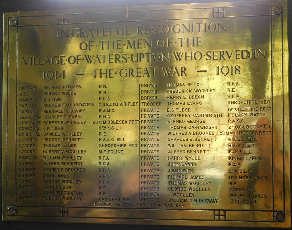 Below is a transcription of the the information on the plaque. I plan to add notes or biographies for all those listed, and others with Waters Upton connections who served in the First World War, with an index, in due course.